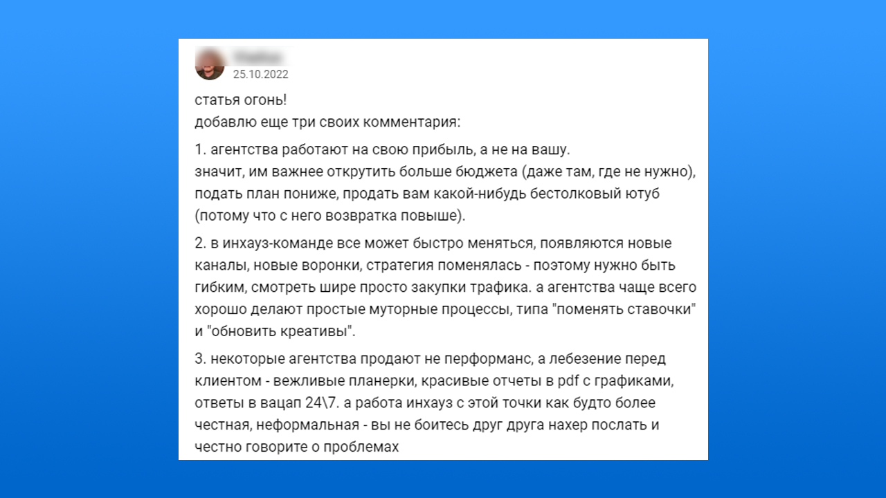 Поэтому не надо думать о том, как мотивировать агентство. Лучше при выборе агентства обращайте внимание на то, как выстроены процессы в нем и насколько системно оно работает.
