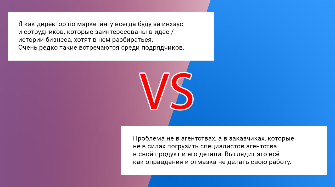 Борьба между инхаус отделом маркетинга и внешним подрядчиком должна однажды закончиться и стать совместной работой. Поделюсь своим видением ситуации и личным опытом такого сотрудничества.