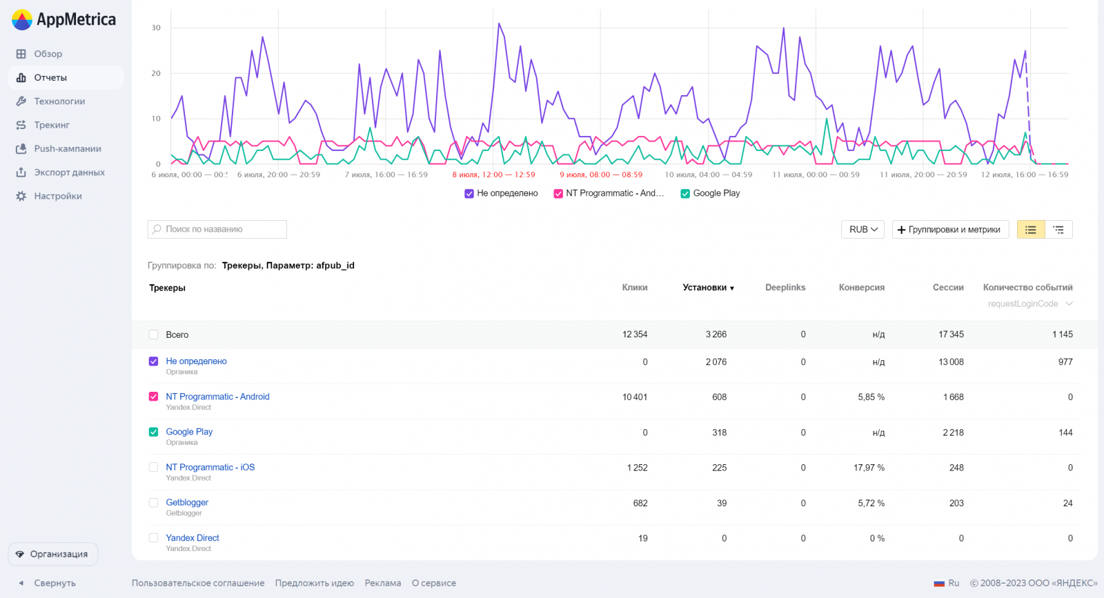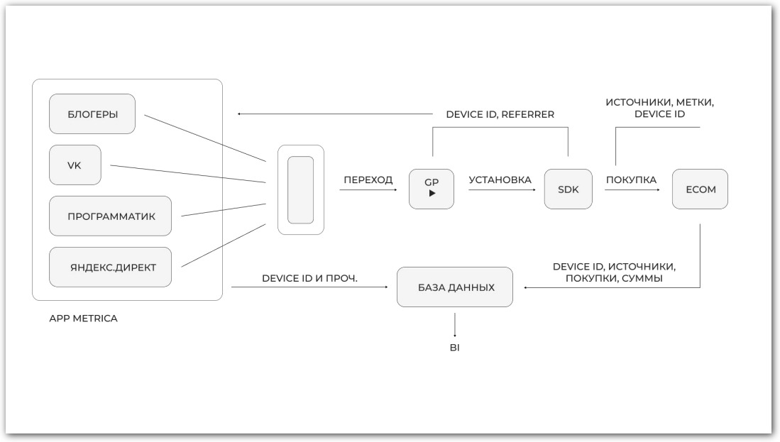 Сюда же система сквозной аналитики направляет данные по эффективности каждого канала — сколько пользователей пришло, сколько совершило покупки. Разносторонняя информация помогает оценивать рентабельность и посчитать, насколько дорого бизнесу обошлась каждая загрузка приложения.