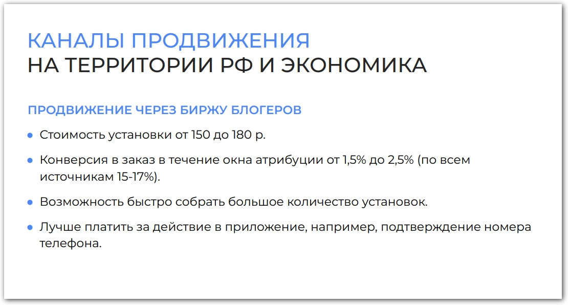 Походит для бизнеса федерального значения с большой аудиторией, где инфлюенсеры генерят много скачиваний. Установка стоит в среднем 150 рублей, конверсия в заказ составляет от 1,5% до 2,5%. Канал работает быстро — можно за несколько дней нагенерить тысячи установок. Блогерам лучше платить за совершение целевого действия в приложении, например, за подтверждение номера телефона — чтоб избежать накрутки ботами.