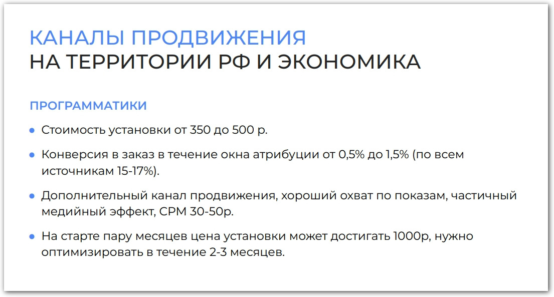 Хорошо работает как дополнительный канал продвижения, дает приличный охват по показам, частичный медийный эффект. Конверсия составляет от 0,5% до 1,5%, средняя стоимость уза установку — от 350 до 500 рублей. У программатиков есть особенность — чем дольше вы работаете, тем ниже цена. На старте установка может стоить 1000 рублей, но через 2-3 месяца цена снизится после автоматической оптимизации.