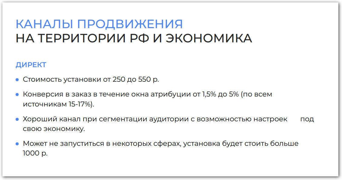 Самый масштабный инструмент в России. Стоимость установки от 250 до 500 рублей — зависит от бизнеса и конкуренции в нише. Конверсия в заказ от 1,5% до 5%. Директ хорошо работает, если у вас сегментированная аудитория — тогда можно точно настроить кампанию и запуститься на самую «горячую» аудиторию. В некоторых сферах запускать Директ невыгодно из-за высокой цены — она превышает отметку 1000 рублей за скачивание.