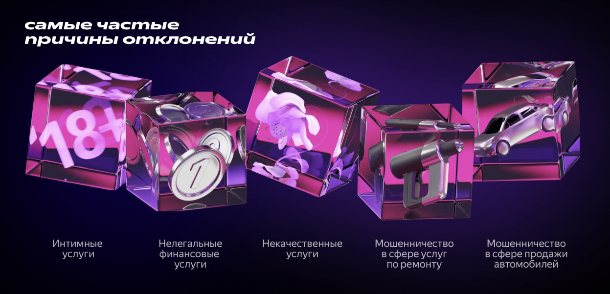Статистика Яндекса говорит о 27 млн отклонённых объявлений и 66 тысяч заблокированных аккаунтов, это в 1,5 раза больше, чем годом ранее.