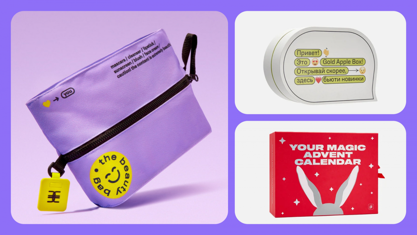 У компании есть и special-боксы — это, например, праздничный адвент-календарь с косметикой и goldapplebox — набор в матовой коробке с выборочной лакировкой и фирменным жирным, нестрогим гротескным шрифтом без засечек. Процесс их распаковки напоминает момент праздника — ты ощущаешь себя ребёнком, который открывает подарок к Новому году.