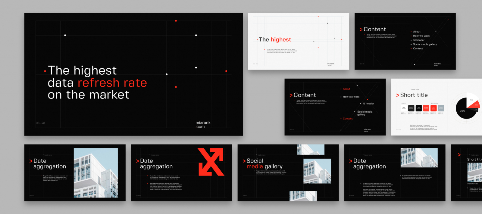 Итогом нашей совместной работы стала комплексная айдентика с нестандартными приёмами, которая подчеркнула позиционирование компании и выделила её на рынке. От команды MixRank мы получили максимально положительный фидбэк — ребята активно используют разработанные нами дизайн-решения на сайте и других диджитал-носителях.
