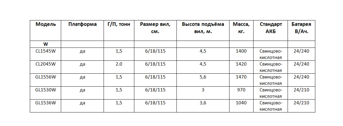 Модели следующей серии W являются более мощными и используются для перемещения сформированных на поддоне, паллет с грузом. Модели уже имеет платформу для оператора и боковые поручни для удобства работы и его защиты, находясь на платформе, он может перемещаться вместе со штабелёром. Эта техника по своей конструкции и назначению приближается к полноценным погрузчикам. Оснащены достаточно мощными свинцово-кислотными аккумуляторами с необходимостью их периодического обслуживания.