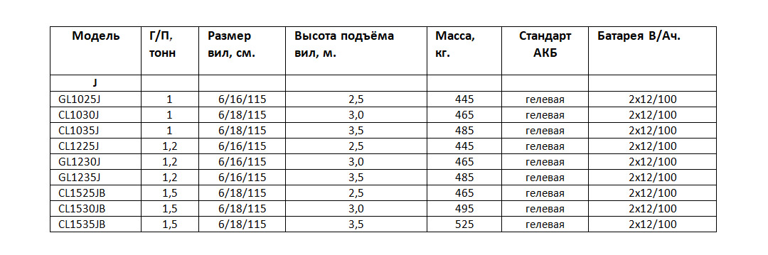 Конструкция модели J включает: Раму, шасси с мачтой, вилы, подъёмный механизм, опорные ролики, ведущее и дополнительное колесо. На рукоятке управления находятся индикатор заряда гелевого аккумулятора, клавиша подъёма и опускания вил, акселераторные ручки, клавиша стоп, реверс, кнопка подачи сигнала. Преимущества модели очевидны, при невысокой стоимости он легко справляется с задачей перемещения грузов на поддонах. Может использоваться в различных помещениях.