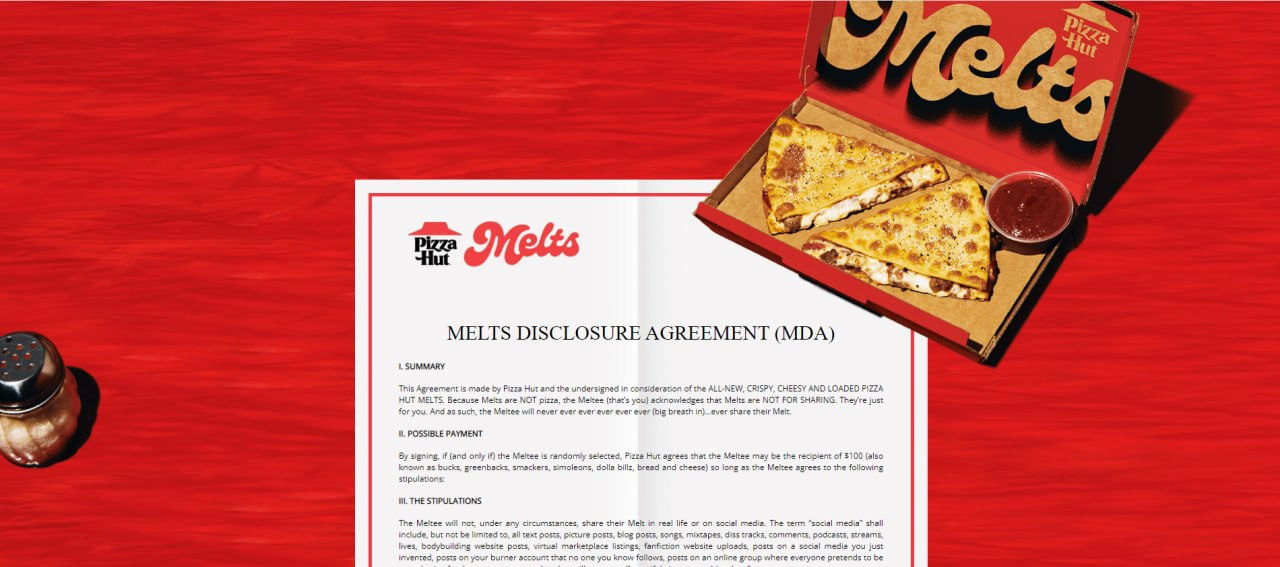 Pizza Hut добавила в меню новое блюдо — закрытые пиццы Melts. Для продвижения новой позиции Pizza Hut создала сайт, где пользователи могли подписать документ о неразглашении информации о Melts — MDA (как NDA, но только для пиццы). В соответствии с «контрактом» покупатели не должны делиться купленными Melts в реальной жизни и в соцсетях — выкладывать фотографии пиццы в блогах, записывать о ней подкасты, рассказывать на сайтах для бодибилдеров и писать фанфики. Также пользователи не могли превращать Melts в NFT и кормить себя пиццей другой рукой так, чтобы было похоже, что у них есть девушка.