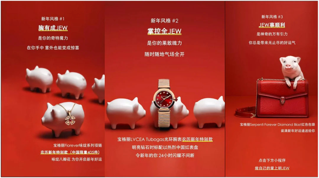 В 2019 Bulgari запустил рекламные материалы, которые включали традиционный красный цвет и символы года — свиней. Однако создатели рекламы не учли игру слов. На китайском языке слово «свинья» произносится как «чжу» (猪), что звучит похоже на произношение слова «еврей» на английском языке. Это вызвало недовольство и непонимание у представителей еврейской культуры, особенно учитывая их религиозные запреты на употребление свинины. Кампанию быстро удалили.