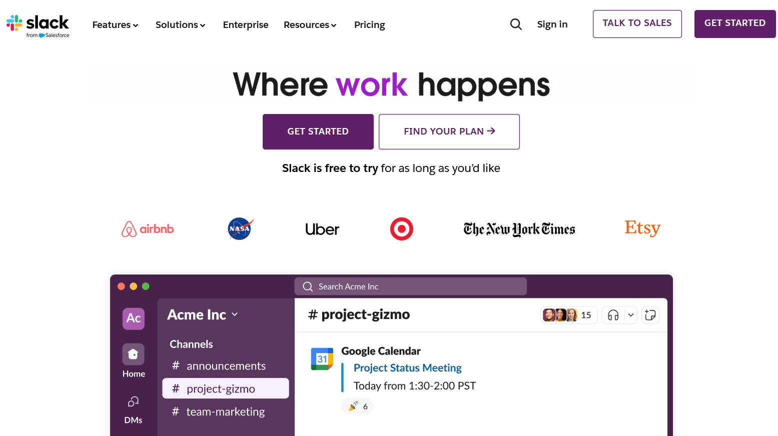 Пример: лендинг Slack использует заголовок: «Где происходит работа», а подзаголовок: «Slack можно использовать бесплатно столько, сколько захотите».