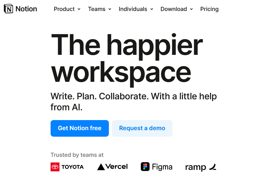 Пример: лендинг Notion сразу обозначает задачи, с которыми может помочь. Отдельно подчёркивает функцию AI-помощника и крупные компании, которые уже пользуются сервисом.