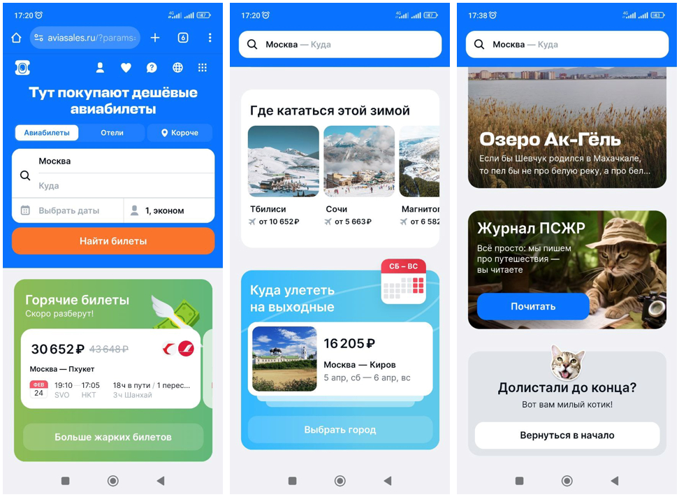 Пример: «Авиасейлс» в мобильной версии сделал лендинг с понятной навигацией по блокам страницы, а вверху закреплена форма для бронирования билетов.