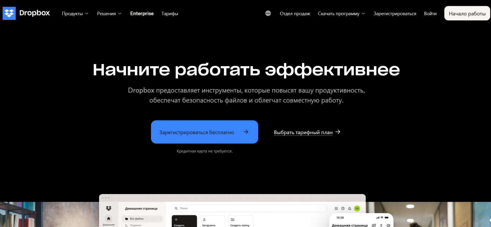 Пример: Dropbox на лендинге предлагает зарегистрироваться, запрашивая только email и пароль или данные аккаунта Google или Apple.