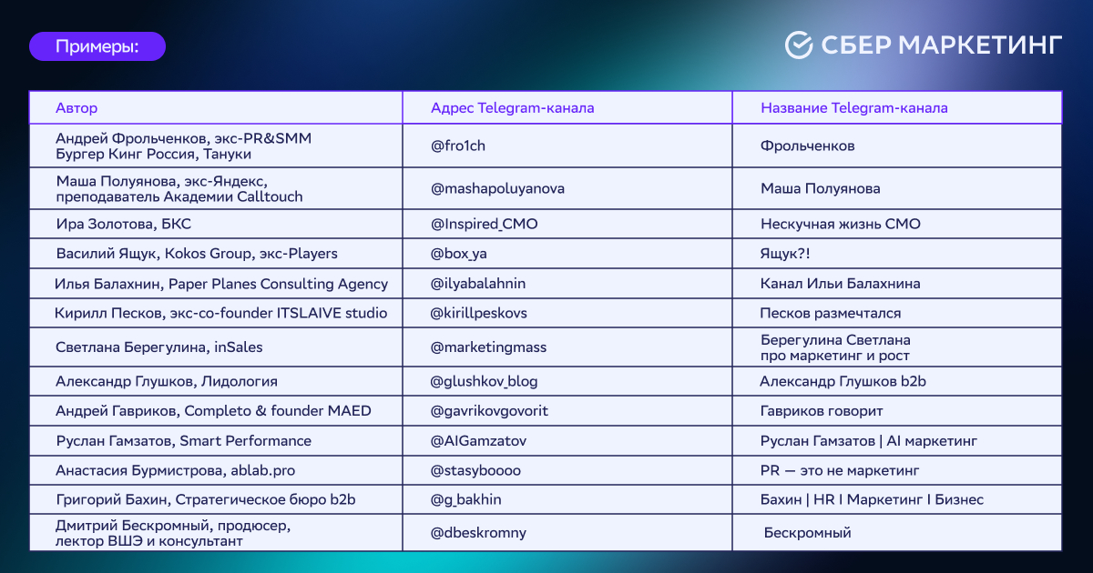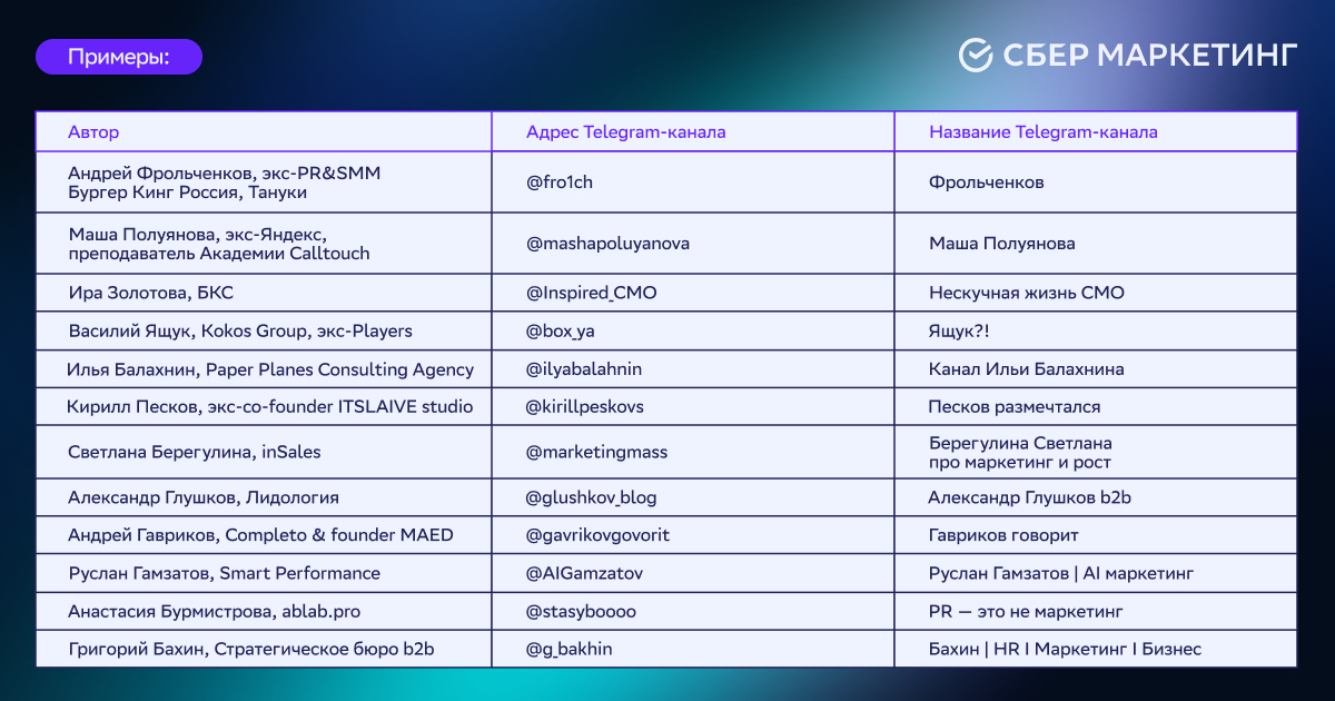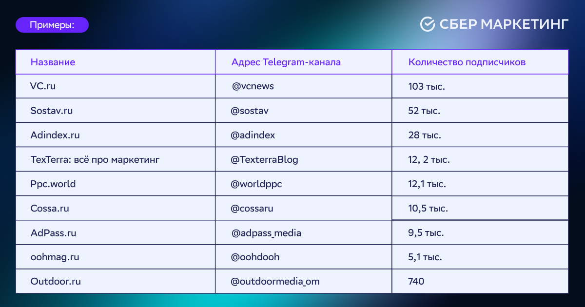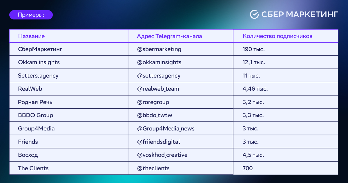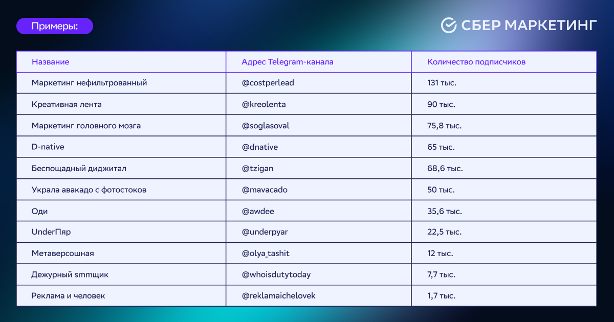 Если вы хотите, чтобы ваш Telegram-канал мы добавили в списки выше, напишите нам на почту pr@sbermarketing.ru