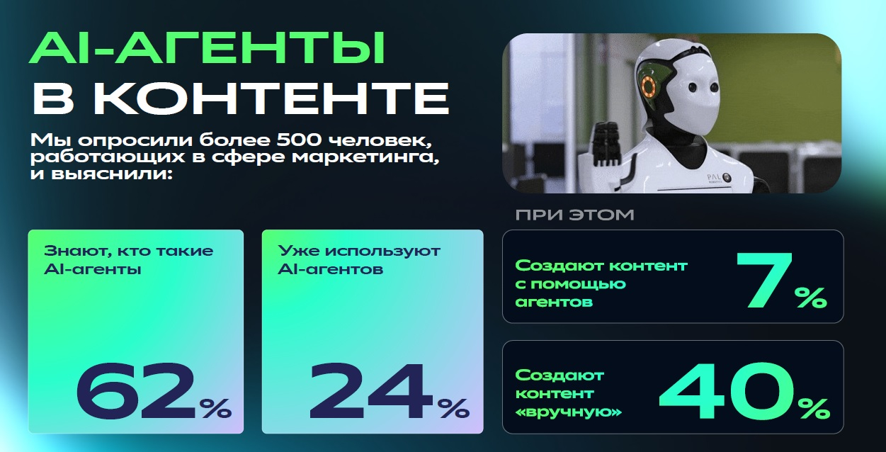 Несмотря на кажущуюся зрелость технологий, разрыв между знанием и использованием AI-агентов всё ещё велик. По данным опроса СберМаркетинга, 62% маркетологов знают об AI-агентах, но лишь 24% их реально используют. 7% опрошенных до сих пор ведут соцсети вручную. Это означает, что рынок находится в активной фазе перехода, и те, кто преодолел «страх промпта», уже получают кратное увеличение производительности и высвобождают ресурсы для креатива.