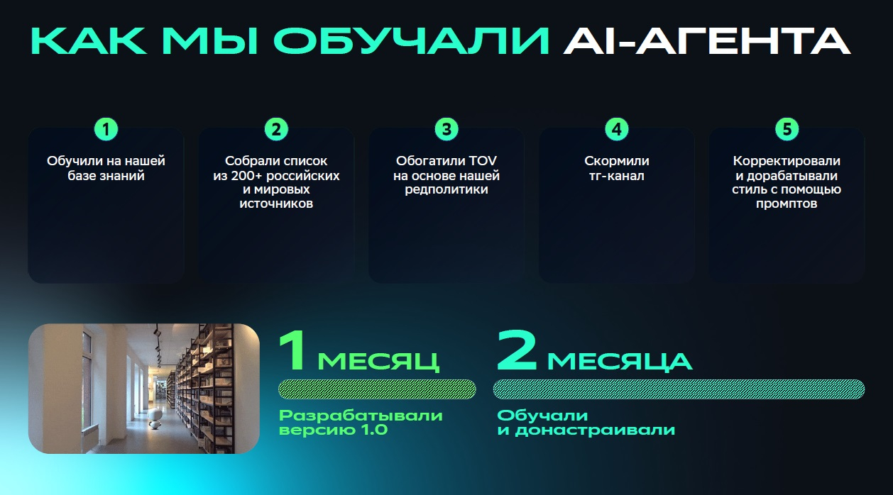 Так, например, в 2025 году в СберМаркетинге создали AI-контент-агента на базе нейросети ГигаЧат, чтобы масштабировать производство без расширения штата. Раньше команда из шести человек тратила 280 часов в месяц на ведение соцсетей и выпускала около 700 постов в год. Разработка агента заняла месяц, еще два месяца ушло на донастройку: в него загрузили — весь контент Telegram-канала компании за несколько лет, редакционную политику, tone of voice, контент-планы и идеи рубрик. Агент научился парсить 200+ источников, включая российские и зарубежные, мониторить тренды, проводить факт-чекинг, предлагать темы, генерировать тексты в нужном стиле и готовить техзадания для дизайнеров.
