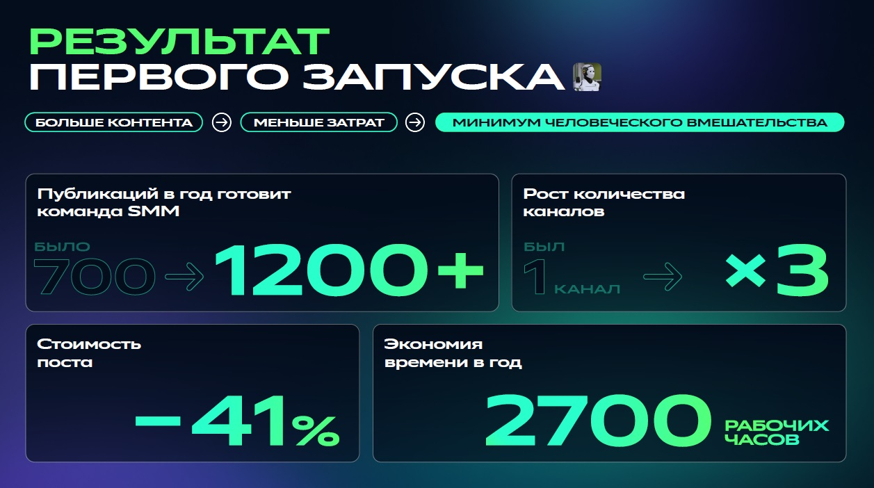 В результате внедрение AI-агента позволило сократить time to market (TTM, время выхода на рынок — период от зарождения идеи продукта до момента его релиза) в 3,5 раза. Количество публикаций выросло с 700 до 1200+, при этом стоимость одного поста снизилась на 41%. Важно отметить, что редактура полностью не ушла: посты от агента проходят вычитку, но теперь это занимает не часы, а 10–15 минут.