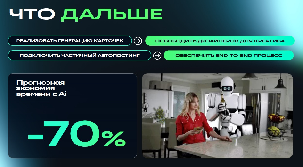 В планах компании — подключить агента к генерации карточек и частичному автопостингу, чтобы обеспечить сквозной end-to-end процесс. Прогнозная экономия времени при таком подходе составит 70%.