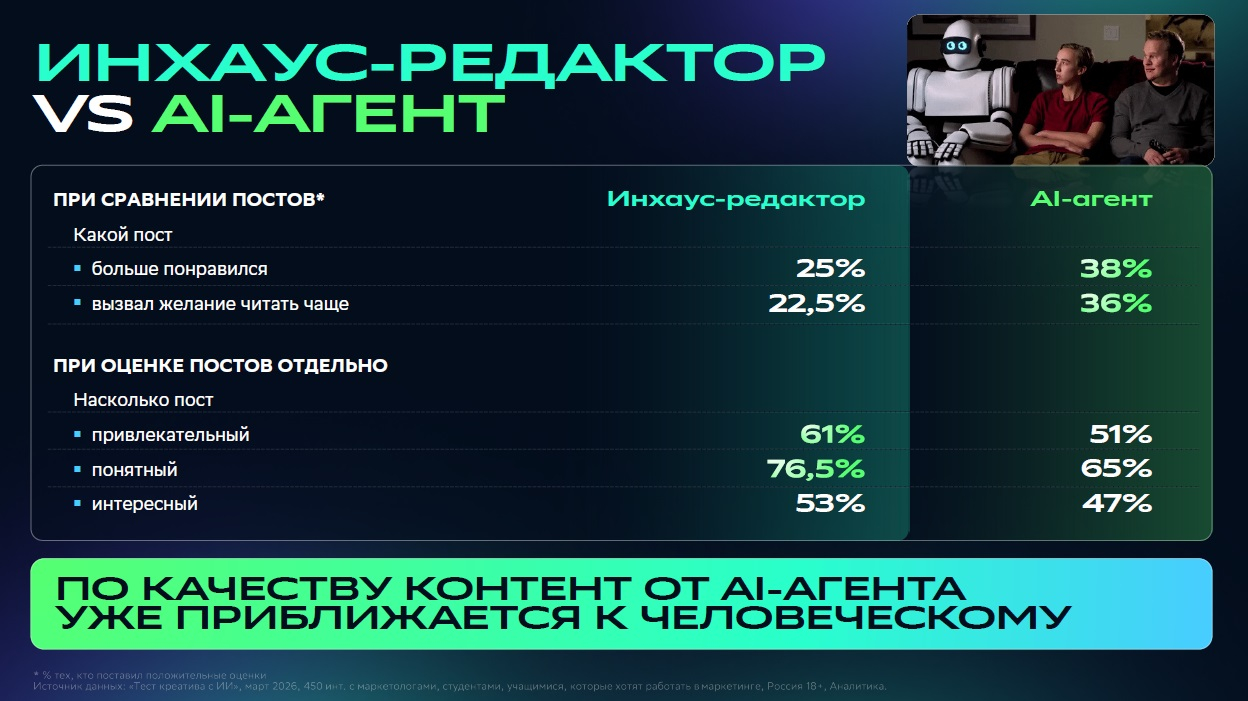 Современный AI-агент — это многофункциональный сотрудник. При этом тестирование показало: AI-контент уже приближается к человеческому по качеству, но пока уступает в привлекательности и смысловой части. За эти две составляющие отвечает живой редактор.