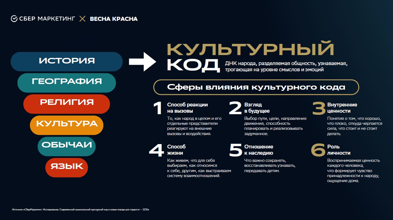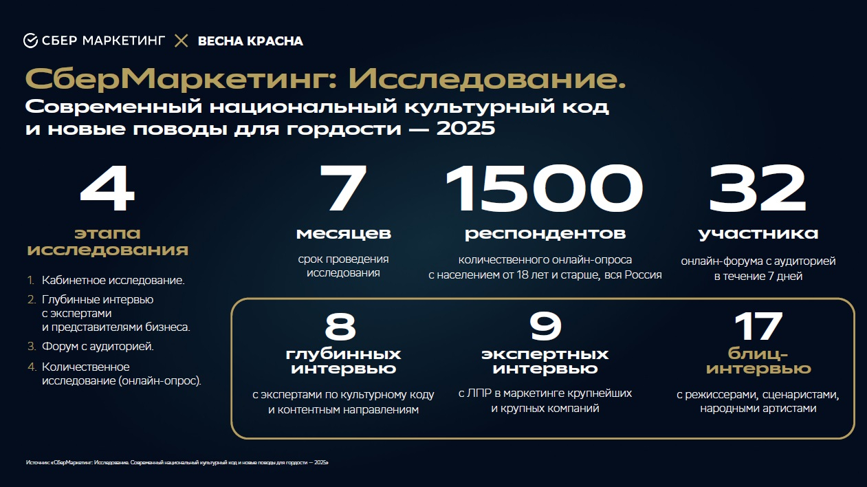 Отправной точкой для дискуссии стало масштабное исследование «Современный национальный культурный код и новые поводы для гордости», проведенное креативным агентством СберМаркетинг в 2025 году. Результаты 9-месячной работы представили Елизавета Афанасьева-Тринич, директор креативного агентства, и Алена Голубева, директор по стратегии. В основе исследования — 4 этапа: от кабинетного анализа медиапространства до глубинных интервью с экспертами и количественного опроса 1500 респондентов по всей России.