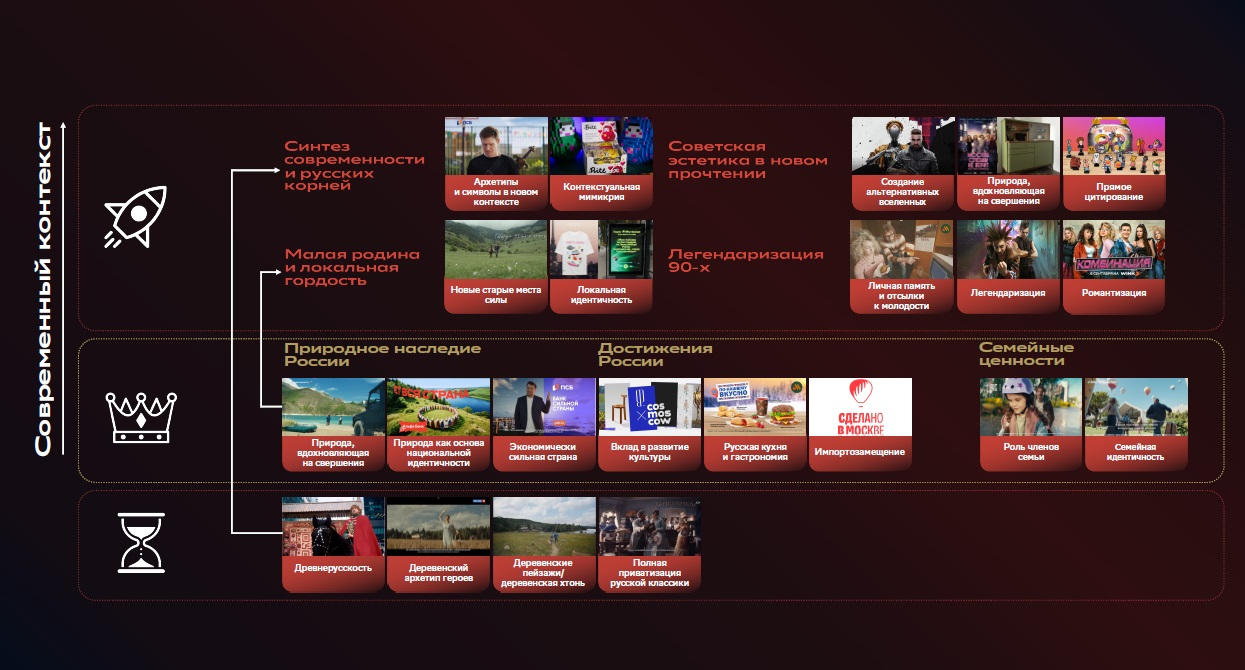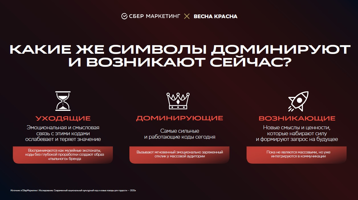 Возникающие символы — те, которые только набирают силу и формируют запрос на будущее. Исследователи зафиксировали несколько направлений, где такие переосмысления происходят успешно: узнаваемые архетипы в новом контексте, создание альтернативных вселенных, переосмысление советского прошлого в новых жанрах, романтизация 90-х и локальная идентичность.