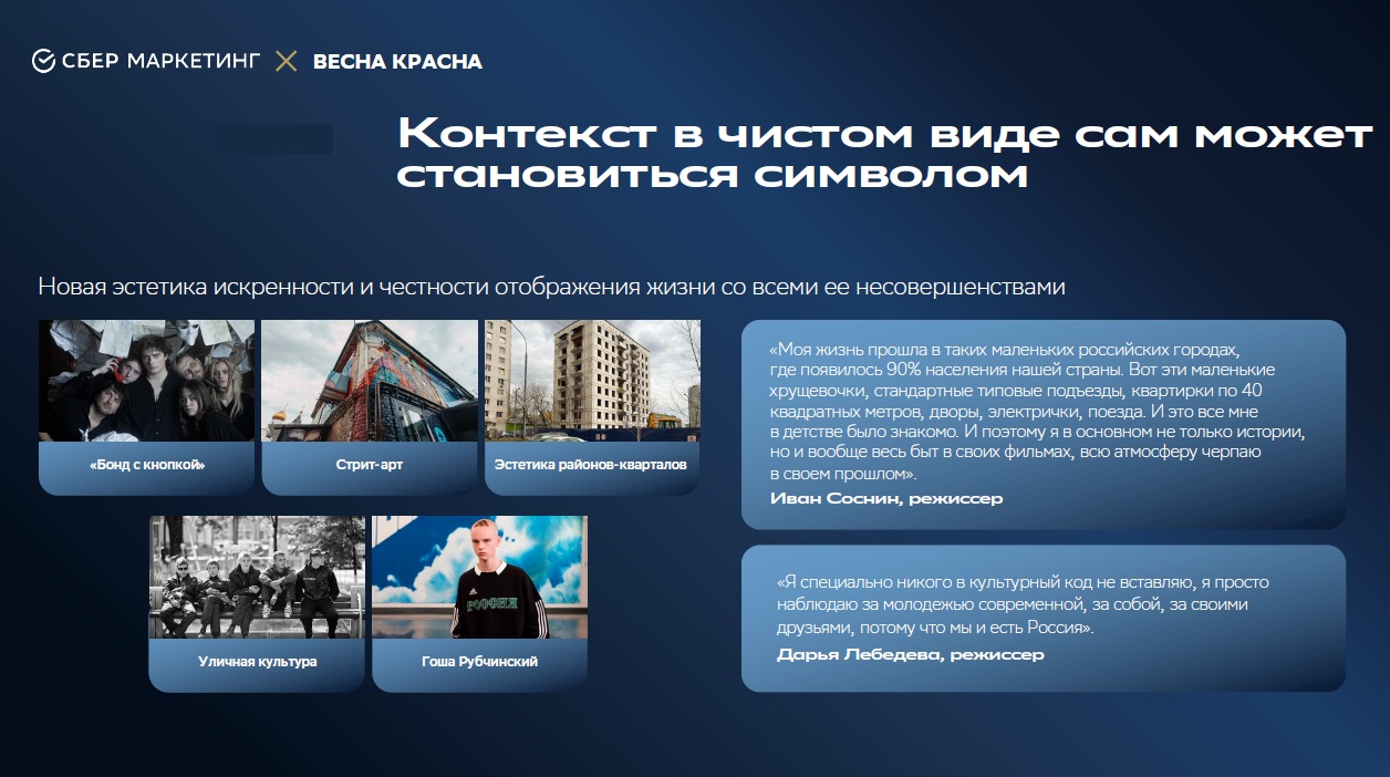 Ещё одним важным открытием исследования стал инсайт о том, что контекст сам может становиться символом. Эстетика спальных районов, искренность и честность отображения жизни со всеми ее несовершенствами — всё это становится частью символьной системы.