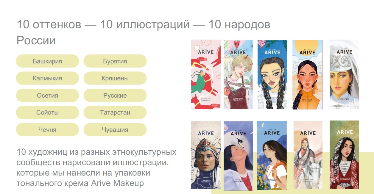 Алина Купорова, руководитель коммуникационного управления бренда Arive Makeup, представила кейс создания тонального крема Comfy Glow Foundation. Бренд разработал палитру средств из 10 оттенков, учитывающих особенности и потребности пользователей из разных регионов и этносов России. При этом главным элементом коммуникации стала упаковка. Для оформления первой партии бренд пригласил 10 художниц-представительниц 10 этнокультурных сообществ страны, каждая из которых изобразила собственное представление о красоте. Кампания стала ярким примером того, как культурный код рождается из категории продукта, призванного работать с разнообразием женской красоты.