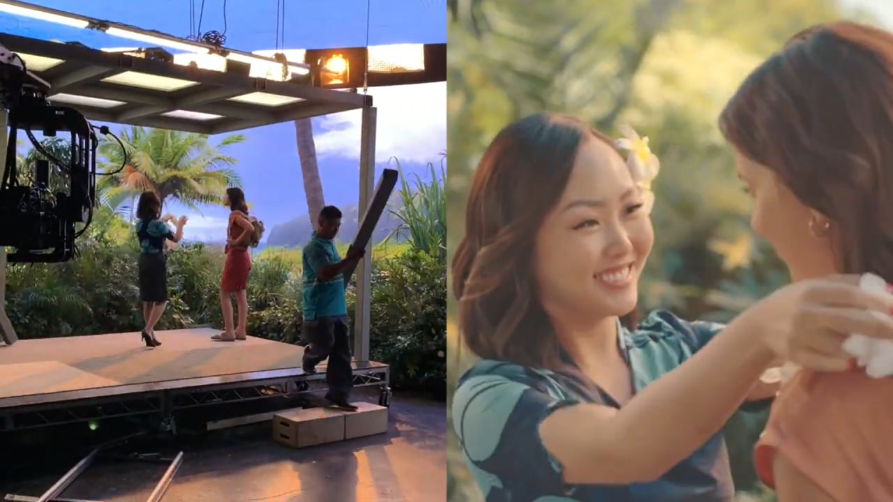 Актёры работали перед 40-футовой светодиодной полусферой, на которую в реальном времени выводилась картина Гавайского заката над океаном. Камера на рельсовой системе медленно приближалась к героям. Декорации разбирались прямо перед объективом, виртуальная среда постепенно входила в кадр, и в конце роликов полностью захватывала пространство. Всё снималось одним кадром и фиксировалось in-camera, без сложного постпродакшена.