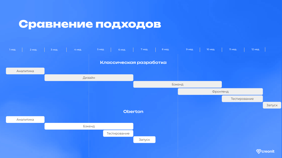 Исключили этапы дизайна и frontend-разработки. За счёт этого уменьшаем сроки запуска и потери контекста при передаче с этапа на этап.