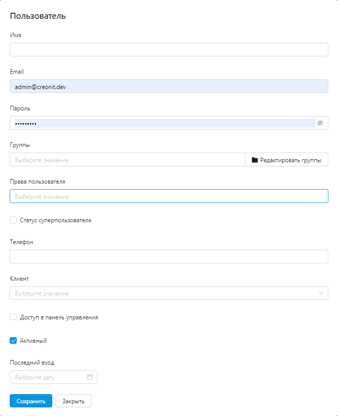 Редактирование состава администраторов, объединение их в группы, настройка доступов для них. Можно назначать суперпользователя — человека, который ограничивает доступ к функциональности другим пользователям и фиксируют, к какому клиенту прикреплён менеджер.