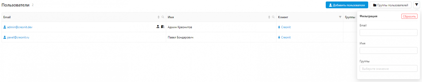 На случай, если администраторов будет много, их можно фильтровать по email, имени и группе.