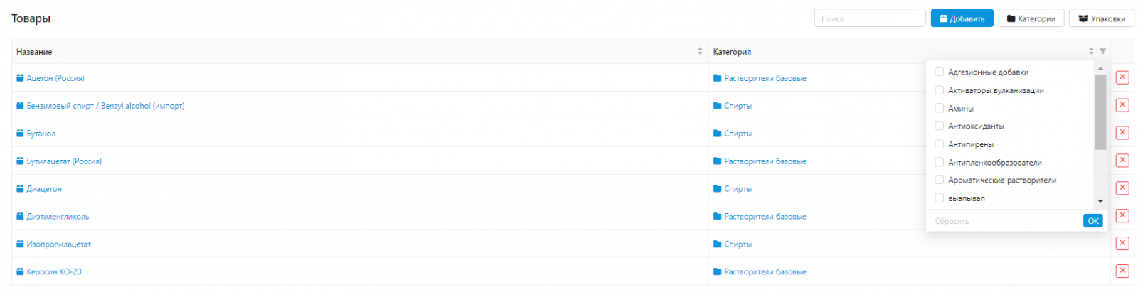 Можно добавлять товары, редактировать категории и подкатегории, а также виды и объёмы фасовки. Доступны фильтрация и текстовый поиск, чтобы специалисту компании было проще найти то, что необходимо отредактировать.