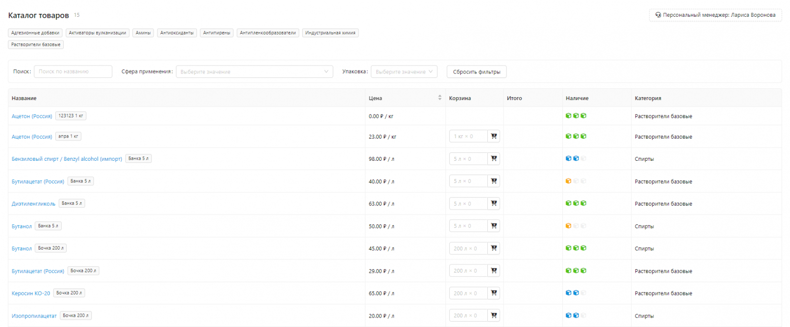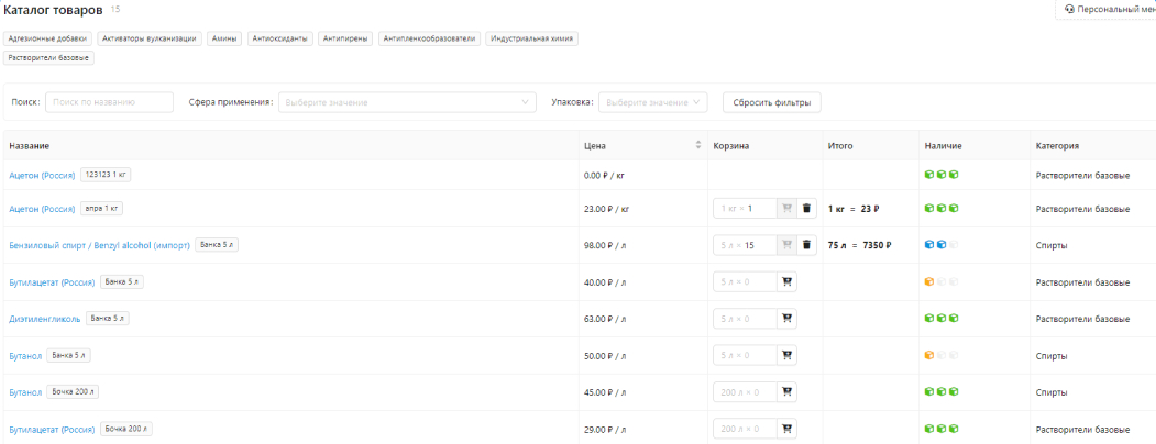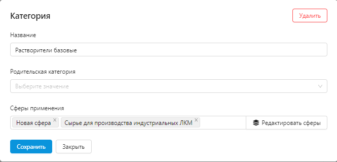 В категориях есть функция настройки сферы применения продукции. Например, базовые растворители используют в качестве сырья для производства индустриальных лакокрасочных материалов. Пользователь будет видеть сферы применения в каталоге, это поможет определить, какой именно продукт нужно заказать.
