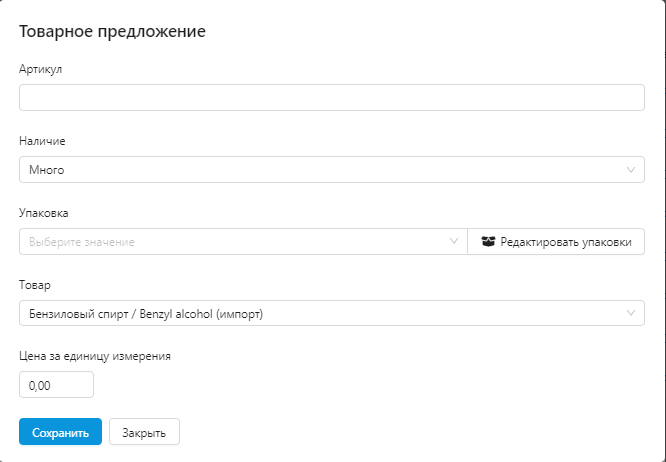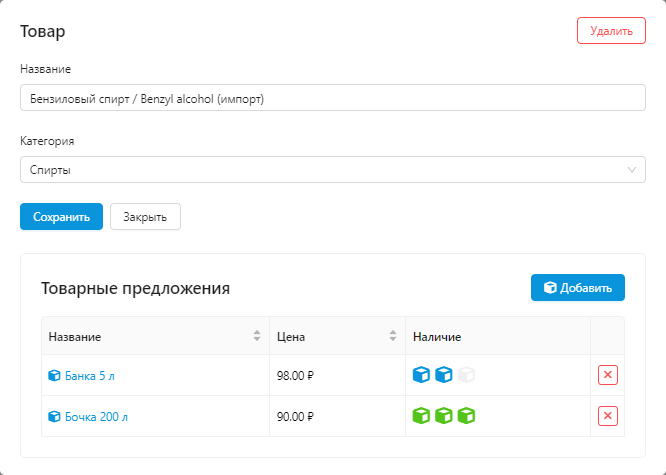 У товаров можно настраивать наличие, вид упаковки, объёмы фасовки и сразу посмотреть, как информация будет выглядеть в карточке товара.
