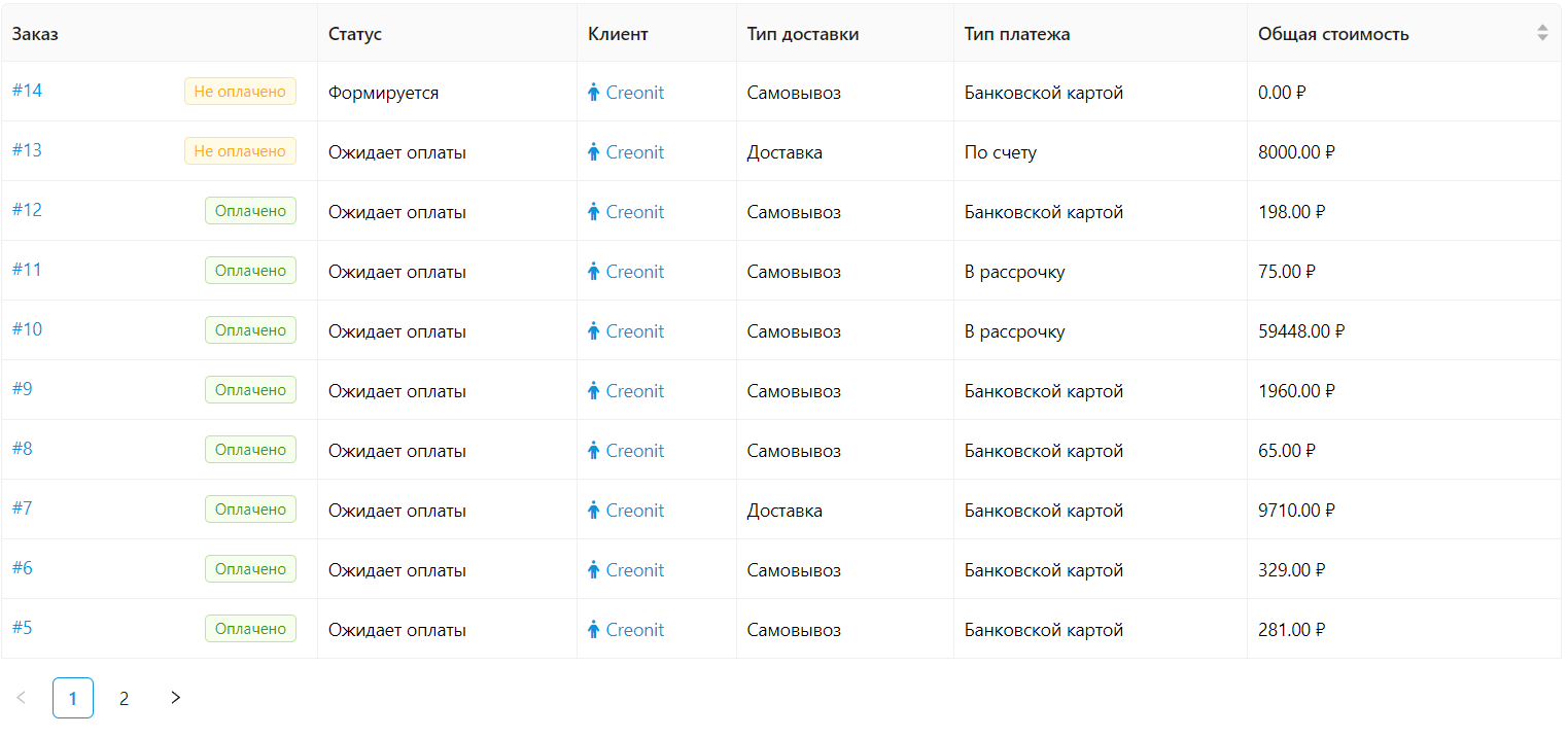 Высвечивается номер заказа, статус оплаты, клиент, тип доставки и платежа, а также общая стоимость.