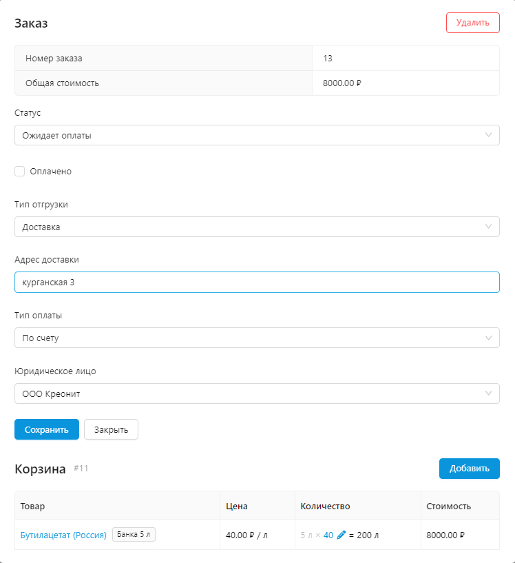 Администраторам доступно редактирование заказа на случай, если клиент что-то неправильно указал и обратился с просьбой поменять данные.