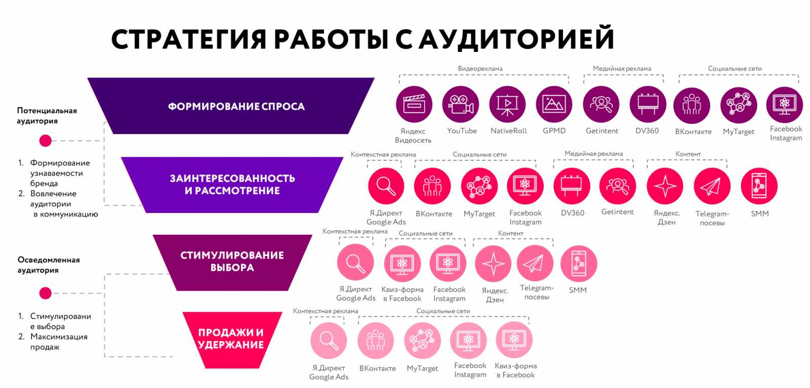 Также для достижения ключевых целей важно было разработать омниканальную стратегию продвижения — комплексный подход, который охватит все этапы пути пользователя по воронке продаж.