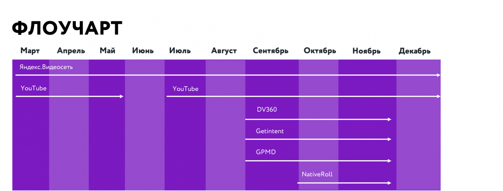 В менее сезонные месяцы бюджет между каналами распределялся равномерно. Перед периодом повышенного спроса и в период (октябрь – ноябрь) увеличилась доля медийной рекламы и была подключена работа с контентом. Так реклама охватывала дополнительную аудиторию пользователей, незнакомых с продуктом.