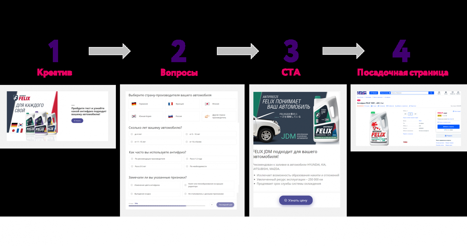 Квиз состоял из 4 пунктов: пользователь выбирал страну-производителя своего автомобиля, возраст машины, частоту использования антифриза, возможные признаки нарушения работы и узнавал, какой антифриз Felix ему подходит и почему. Под результатом квиз-формы находилась кнопка «узнать цену» — она вела на отфильтрованную карточку Felix в Ozon.