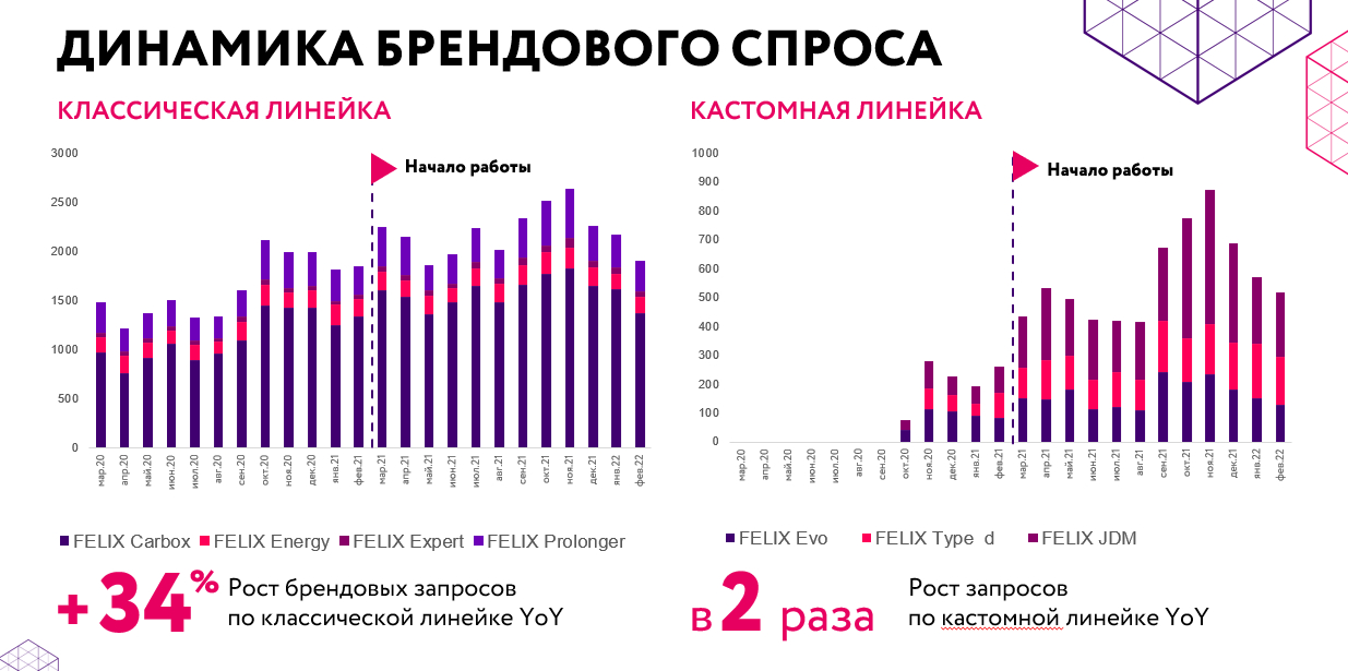 На 34% возросло количество брендовых запросов по классической линейке YoY, и в 2 раза — по кастомной.