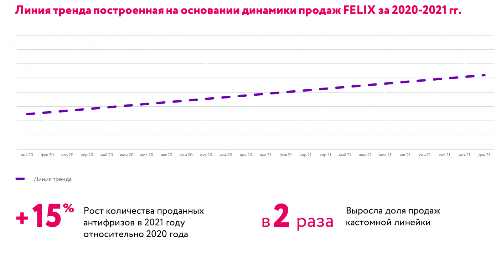 В 2021 относительно 2020 года количество проданных антифризов увеличилось на 15%, пиковый рост продаж был зафиксирован в сентябре 2021. А также в 2 раза увеличились продажи кастомной линейки Felix.