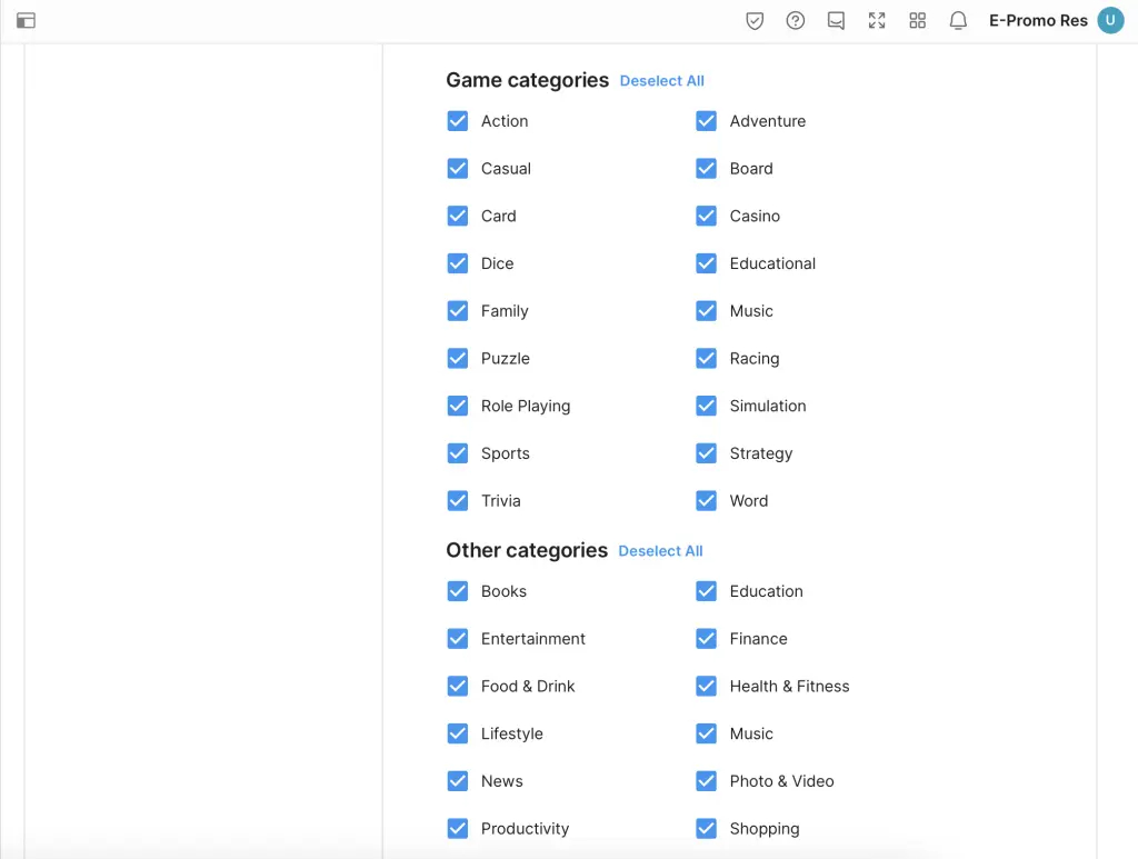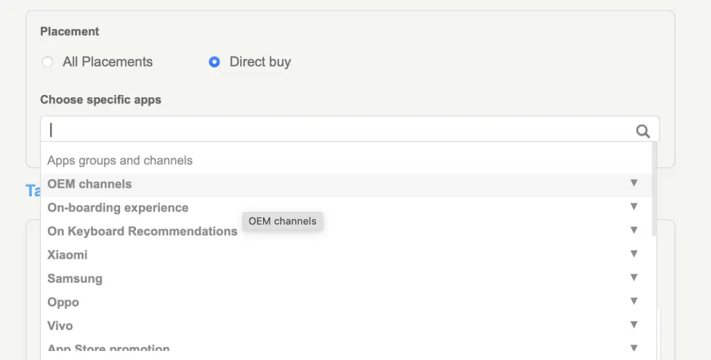 Если приложение ранее не продвигалось в Appnext, то рекомендуется сначала запустить рекламную кампанию во всех доступных плейсментах. Это позволит впоследствии выделить наиболее эффективные приложения в отдельные кампании. Если же вы уверены в эффективности конкретных источников, то мы рекомендуем выделять их в отдельные кампании, чтобы у системы не было возможности израсходовать средства на большой объем всех доступных плейсментов. В настройках рекламы на этапе выбора появятся подсказки по типу или группе площадок, например, OEM channels, On-boarding experience, On Keyboard Recommendations и т. д.