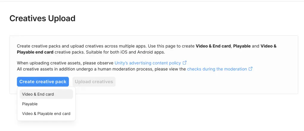 При работе с Unity Ads с целью на установки рекомендуем выбирать конверсионный формат video & end card. Для этого отдельно нужно загрузить видео не более 30 секунд в горизонтальной и вертикальной ориентации и финальную карточку с кнопкой установки. Финальная карточка может быть статичной (появляется в конце ролика отдельным кадром) и динамической (появляется на протяжении всего видео в нижней части).