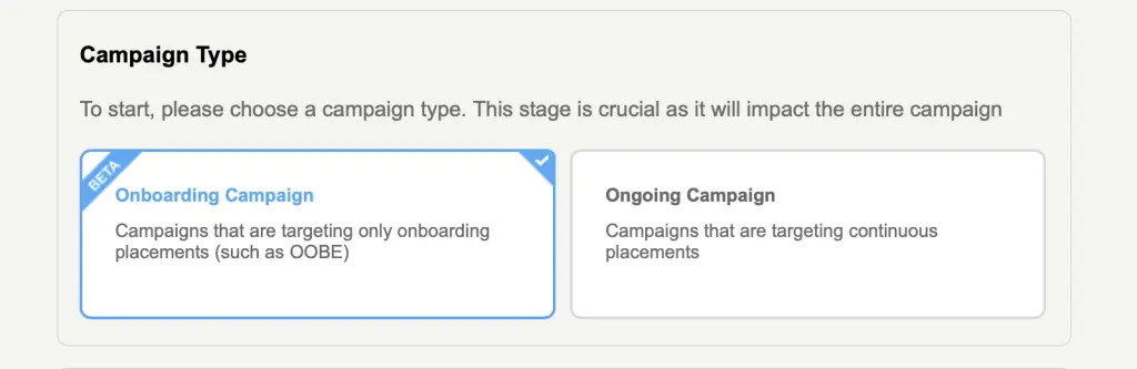 В Appnext существуют 2 типа кампаний: Ongoing Campaign и Onboarding Campaign.