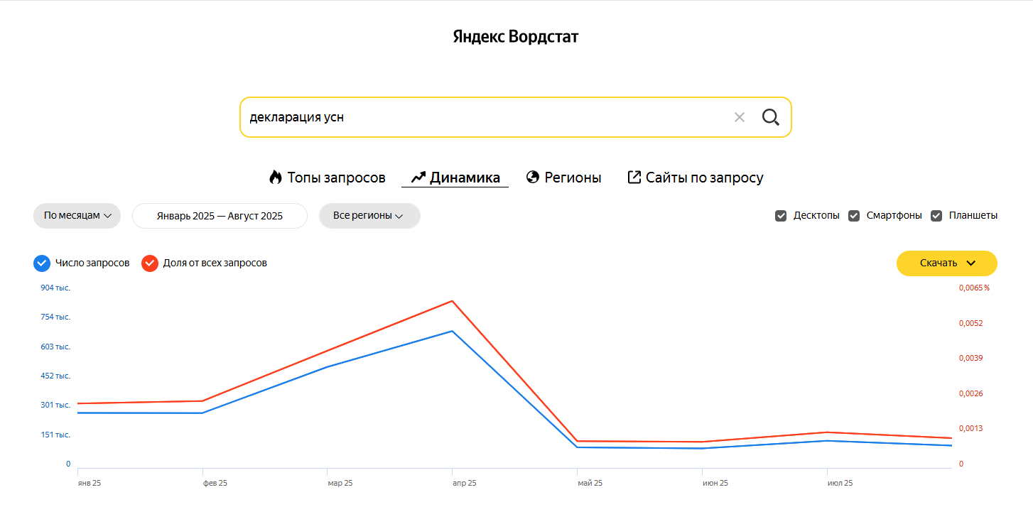 Всплеск запросов в апреле, так как декларация УСН за 2024 сдавалась до 25 апреля, к чему мы и подвязали событийный контент.