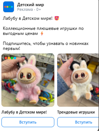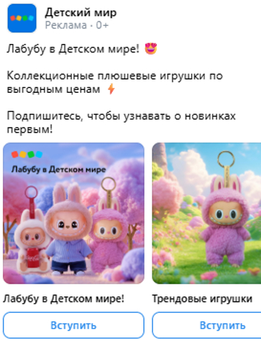 Компания EMP (входит в состав E-Promo Group) совместно с MGCom запустили для крупнейшего ритейлера детских товаров – сети «Детский мир» кампанию с креативами Labubu — игрушек, захвативших интернет в 2024 году. Роль EMP заключалась в управлении рекламной кампанией во «ВКонтакте» по заказу агентства MGCom. Специалисты EMP протестировали органический контент и сравнили его с эффективностью профессиональных креативов.