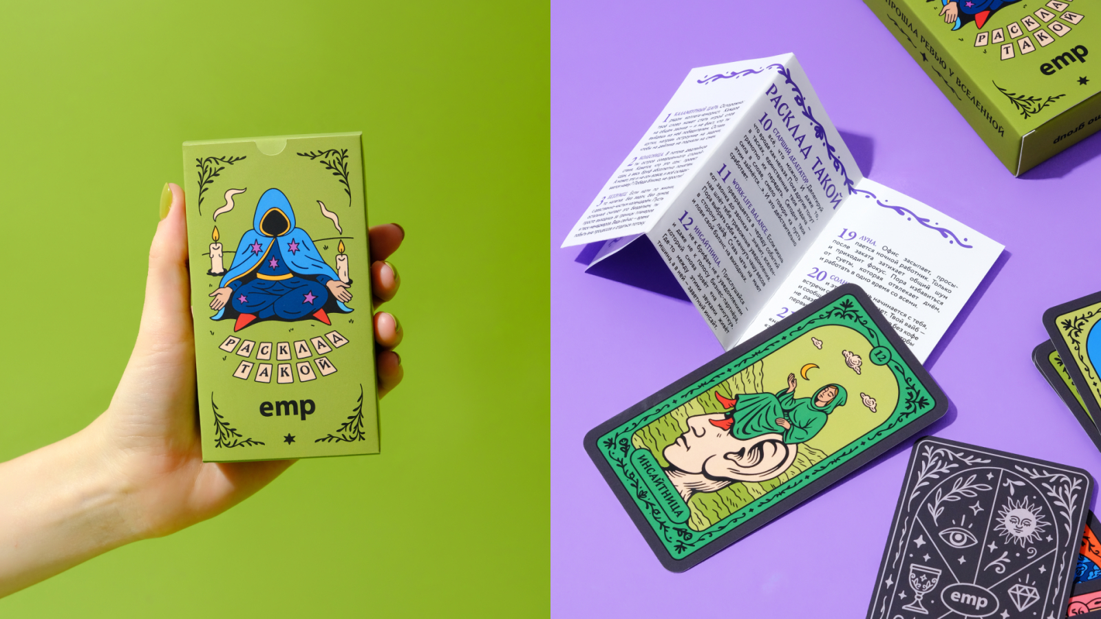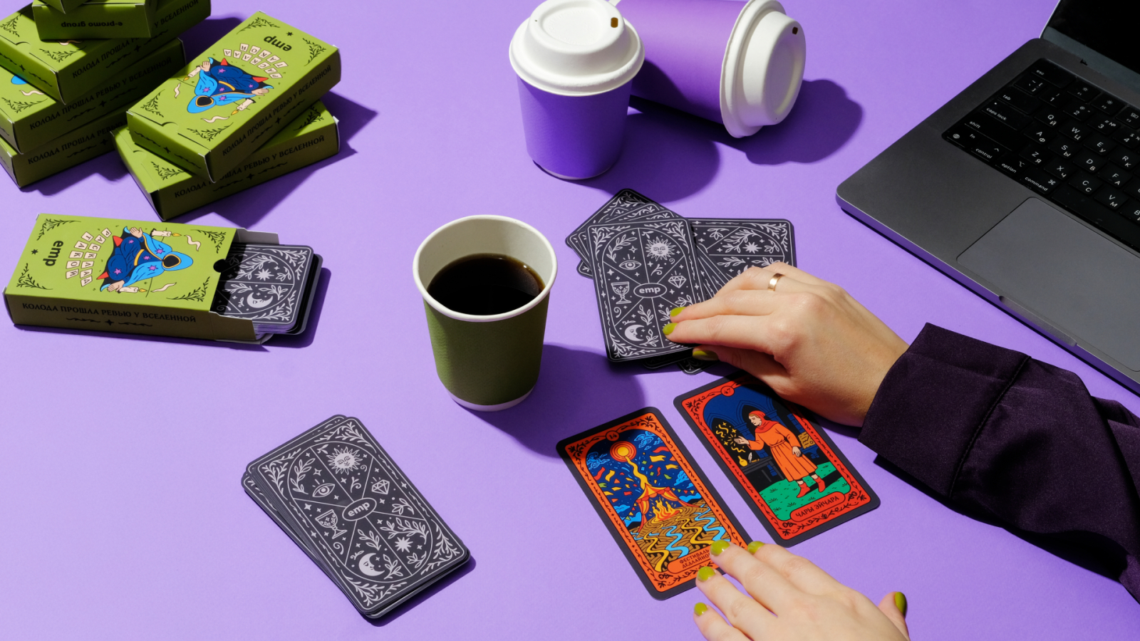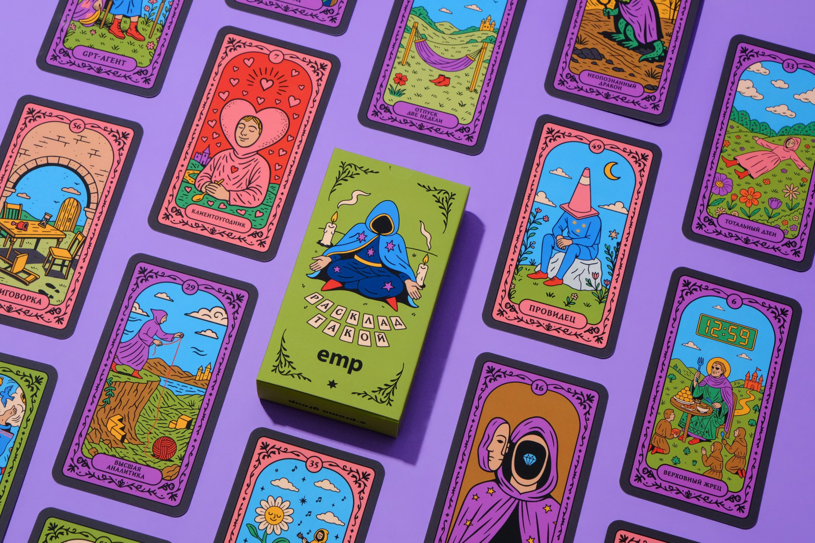 «В процессе создания сплелись два мира: офисная эстетика с ее зумами, дедлайнами, кофе и ироничное средневековье с мантиями и символами. В результате появилось 56 сюжетных карт: от локальных EMP-шных шуток до вечных и знакомых всех рабочих историй».