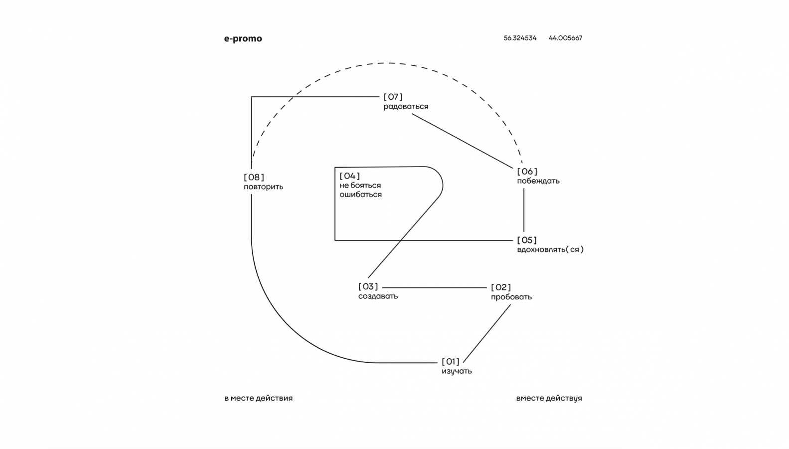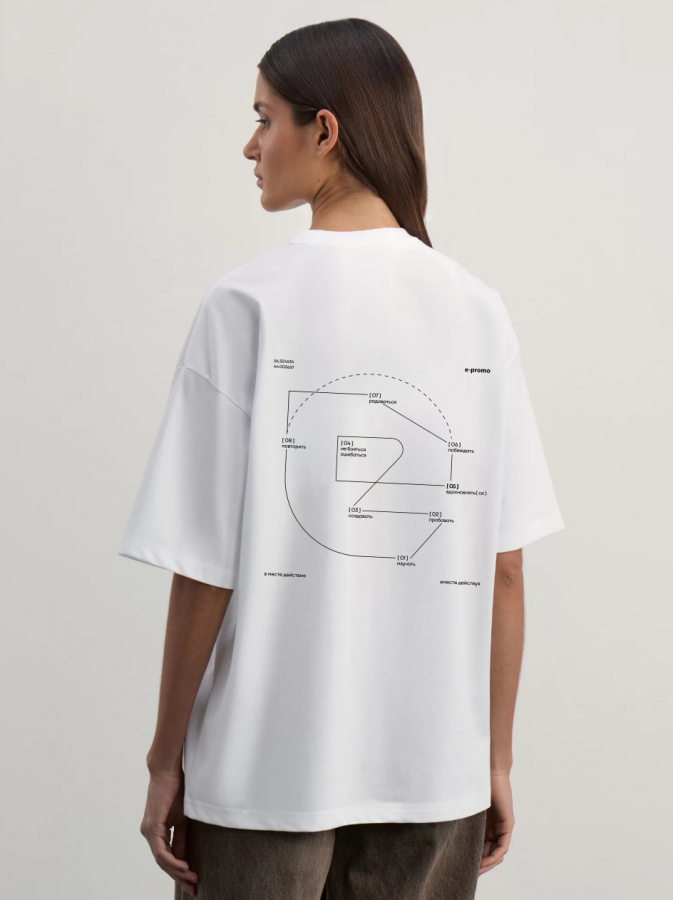 Пример — коллаборация E-Promo x «Родина» в проекте «В месте действия. Вместе действуя». Мы помогли им разработать подарок для партнеров: футболки и худи с картой партнерства. Ломаная линия маршрута отражает движение процесса: от идеи и первых попыток до воплощения и радости побед. А еще линия повторяет силуэт буквы «Е», заглавной буквы E-Promo.