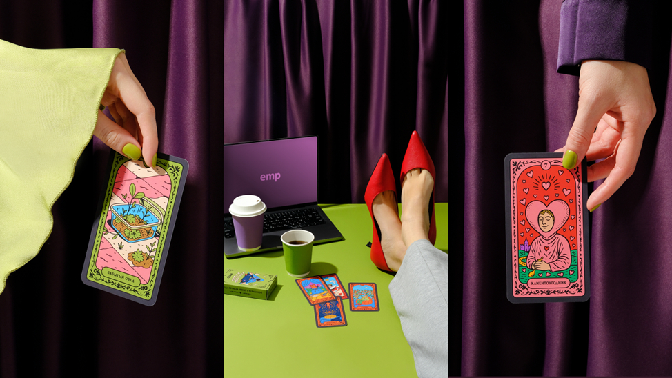 Например, мы помогли разработать компании EMP колоду метафорических карт, которая показывает офисную жизнь с любовью: без корпоративного новояза, зато с шутками про забытый обед, везунчика без единого зума за день и вечного «сейчас перезвоню».