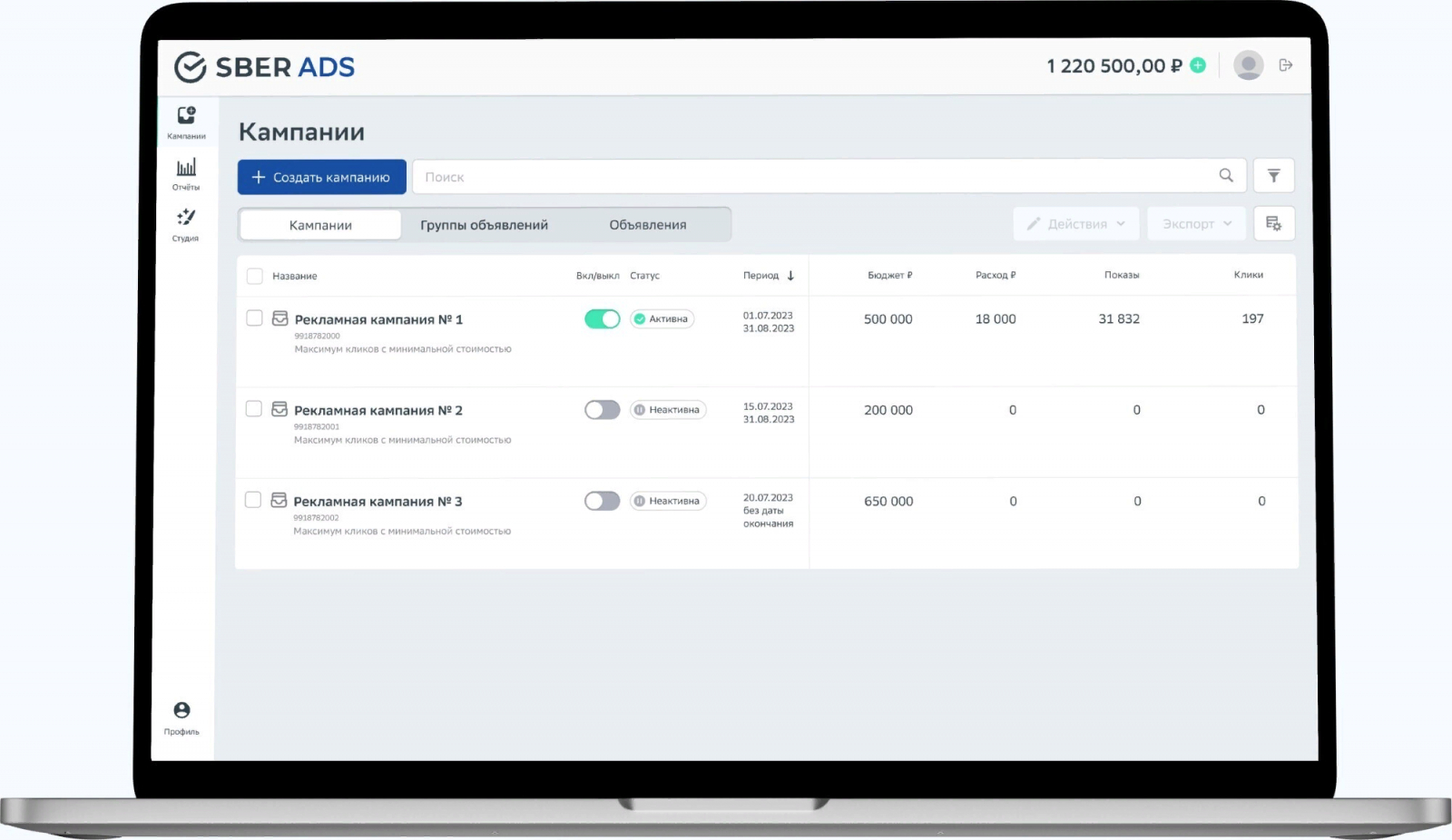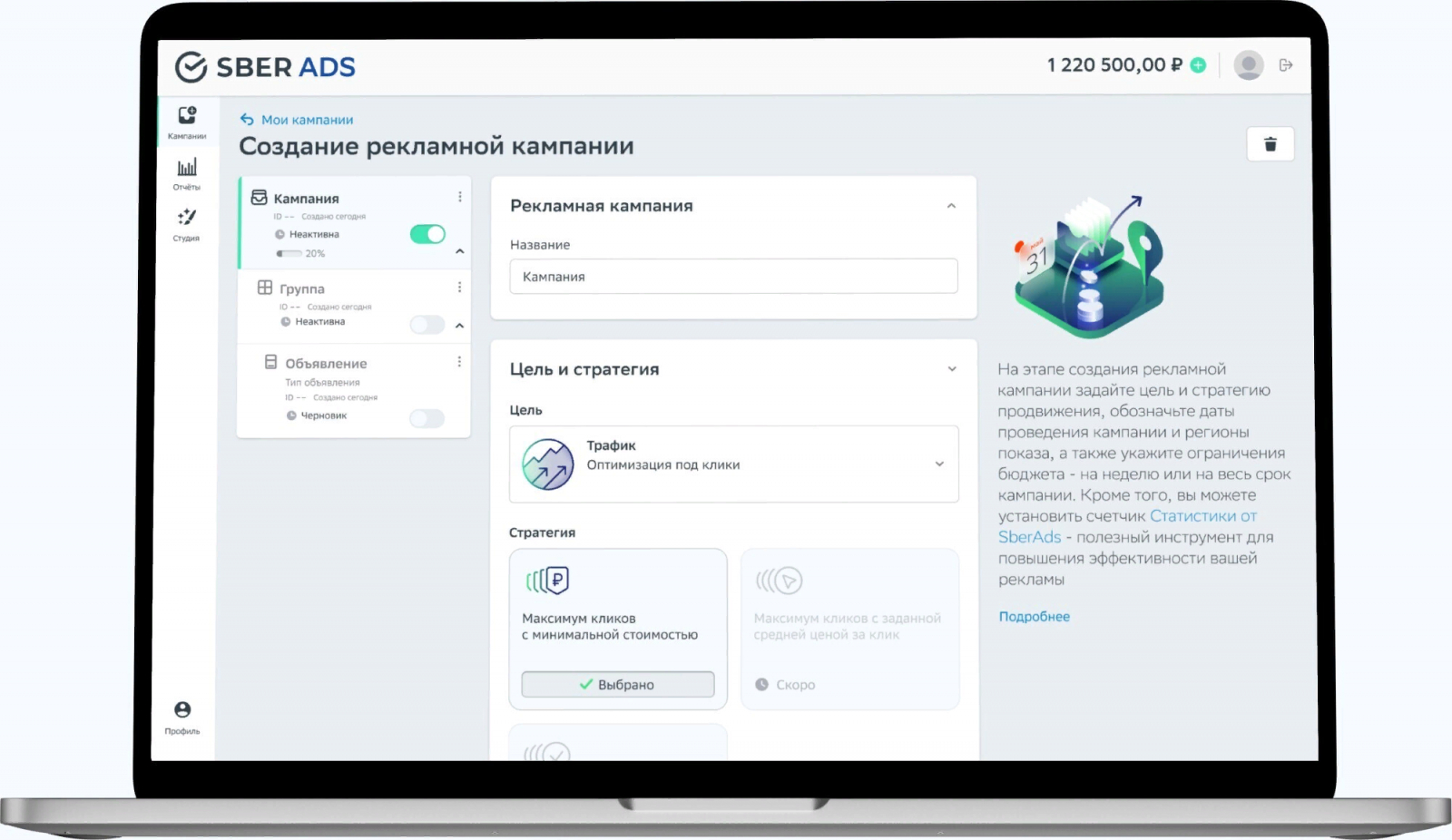 Работать в кабинете SberAds интуитивно понятно, вы сможете запустить кампанию за 4 простых этапа: